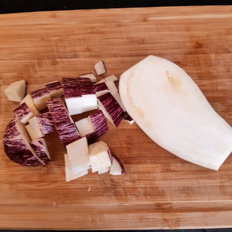 - Was de aubergine. Verwijder het kroontje en snijd de rest in plakken. Doe bij de ui in de pan. Omscheppen en rustig laten bakken.