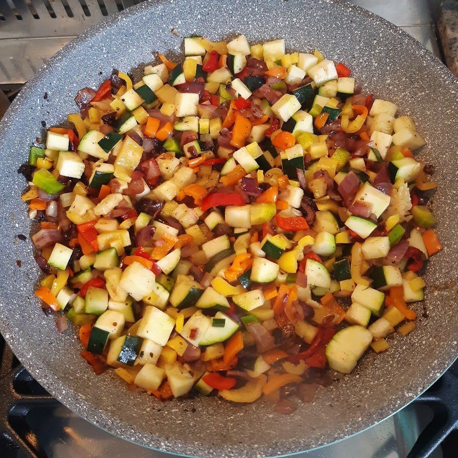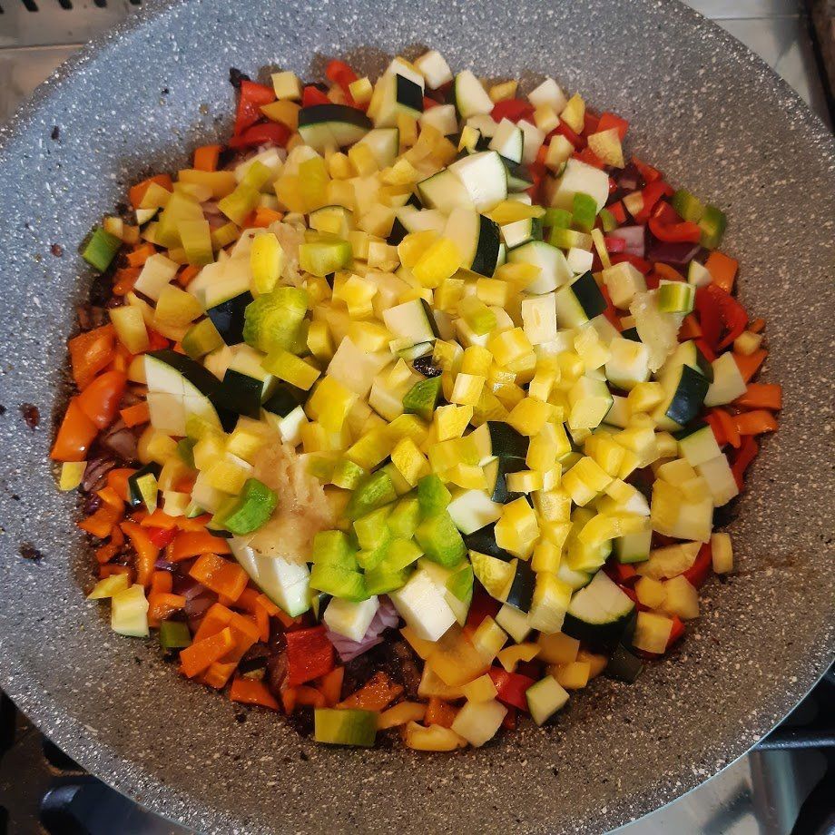 - Wanneer de groenten lichtbruin zijn- zie foto nummer 6, blus dan af met tomatenstukjes en het water.