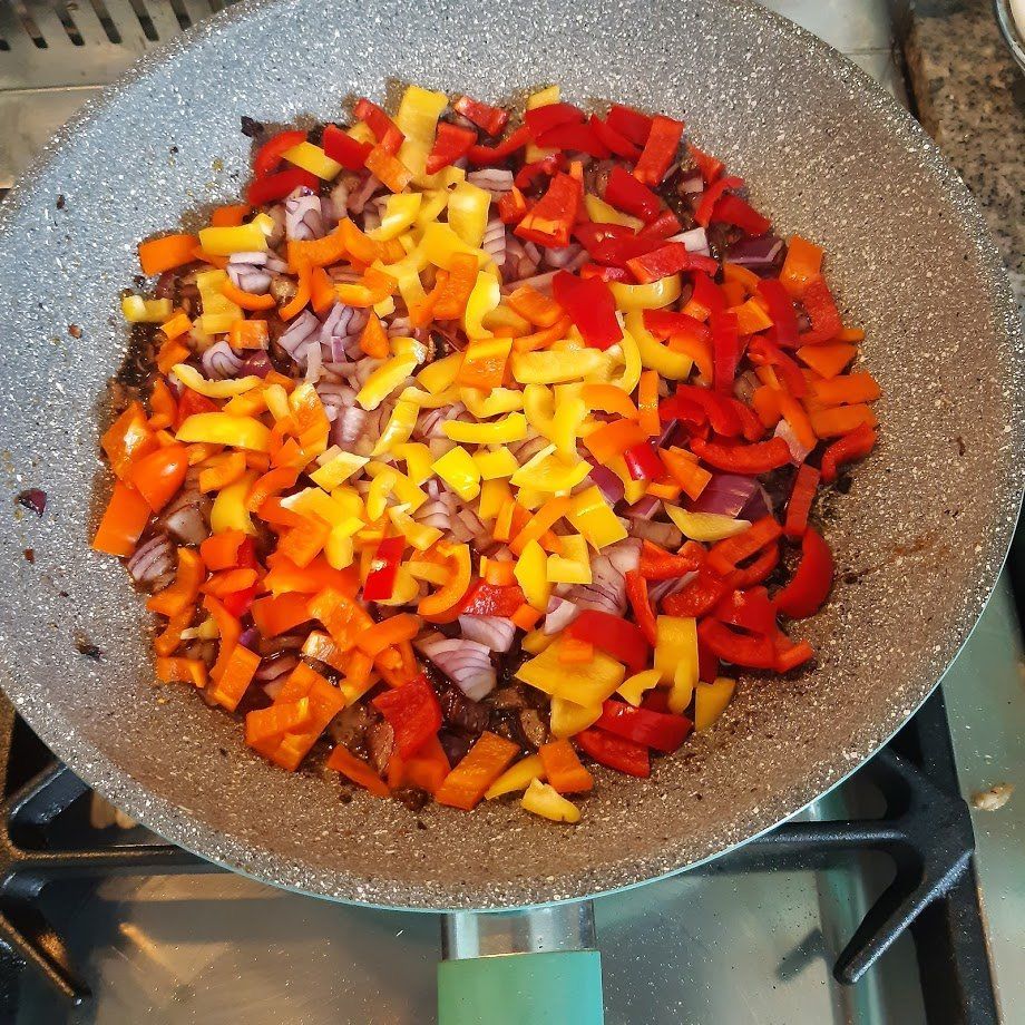 - Was de paprika's. Halveren, zaad en lijsten verwijderen. In blokjes snijden en bij de ui doen.