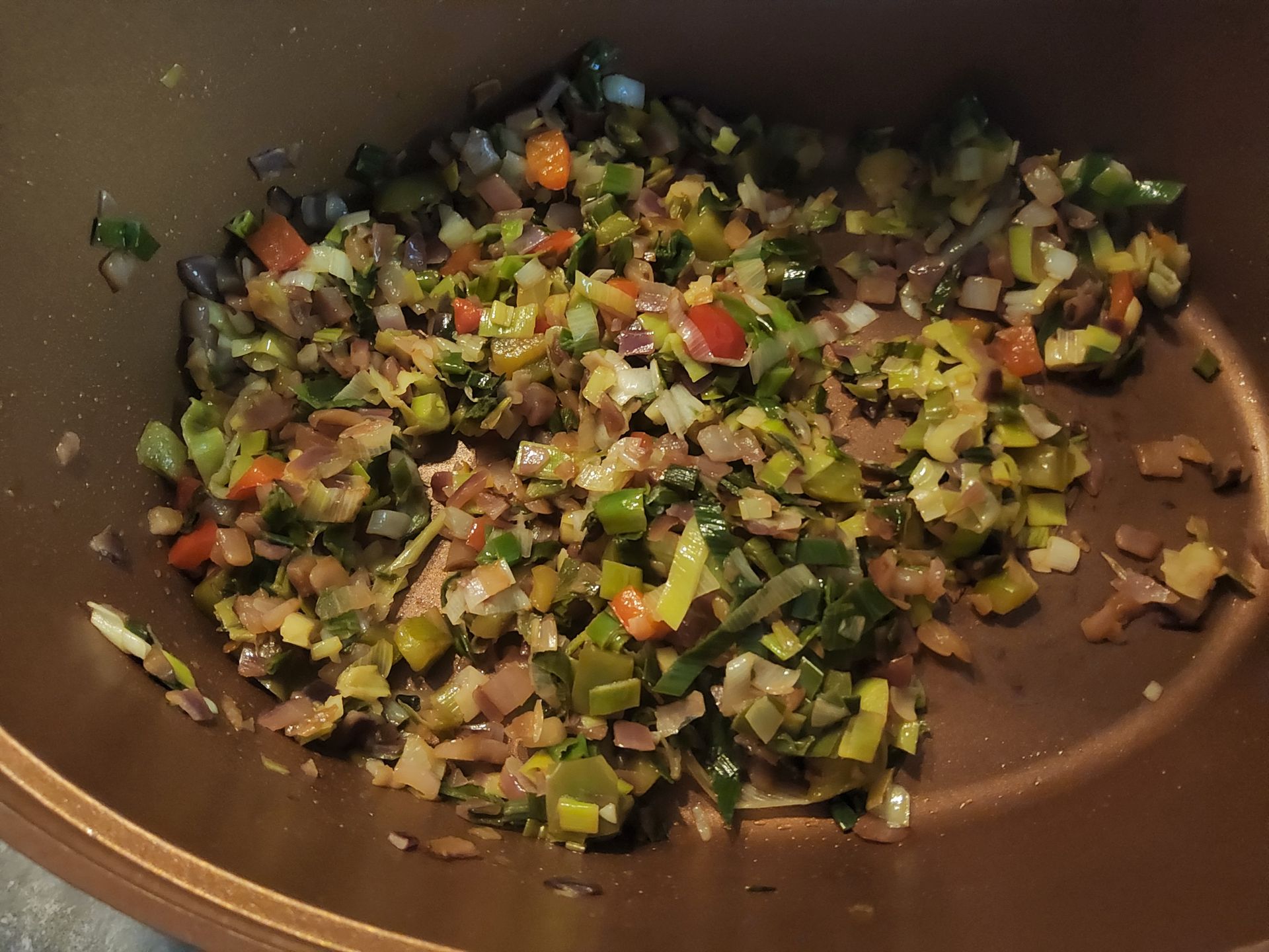- Of, verwarm de olie in een hapjespan en doe daar de groente bij.