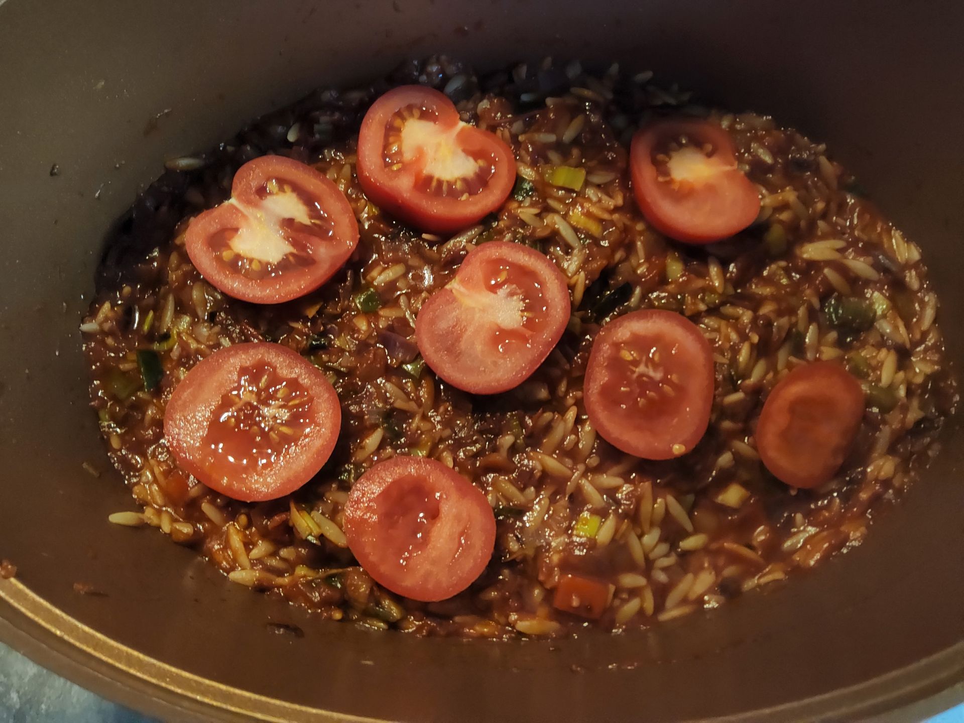 - Snijd de tomaat in plakken en leg het op de groente-tomatensaus.