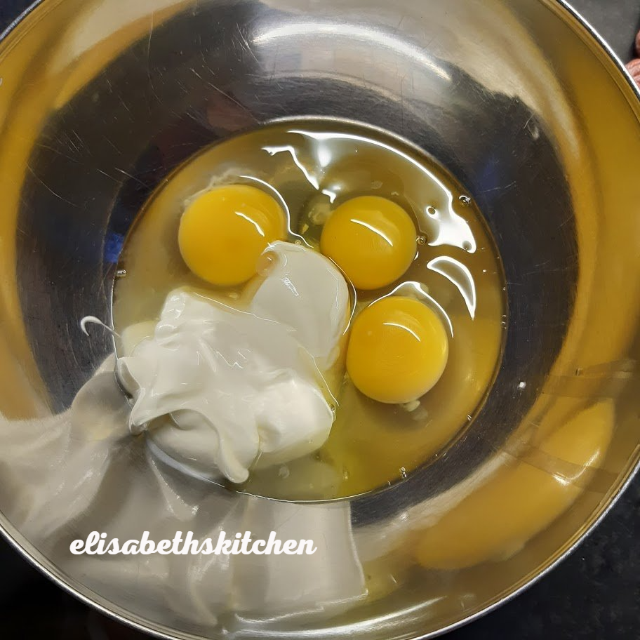 - Klop de eieren los en meng alles goed.