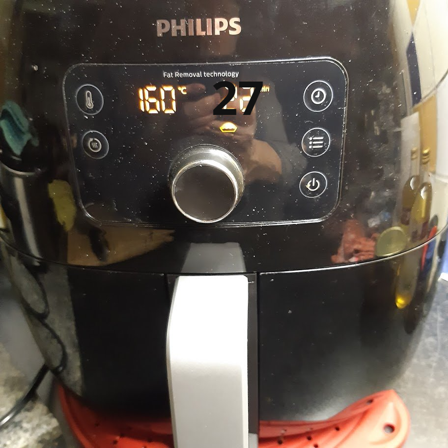 - Zie foto voor de instellingen van de airfryer. Je kabeljauw wordt precies gaar genoeg en het eimengsel vast is geworden en gesouffleerd.