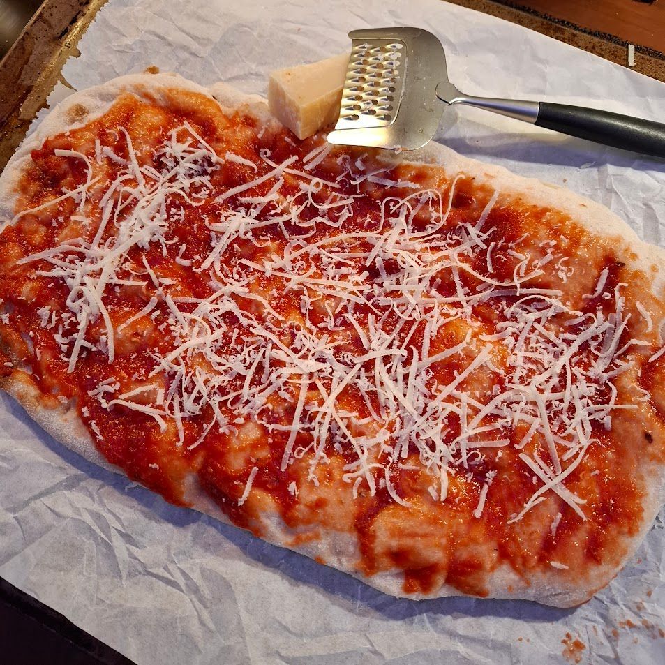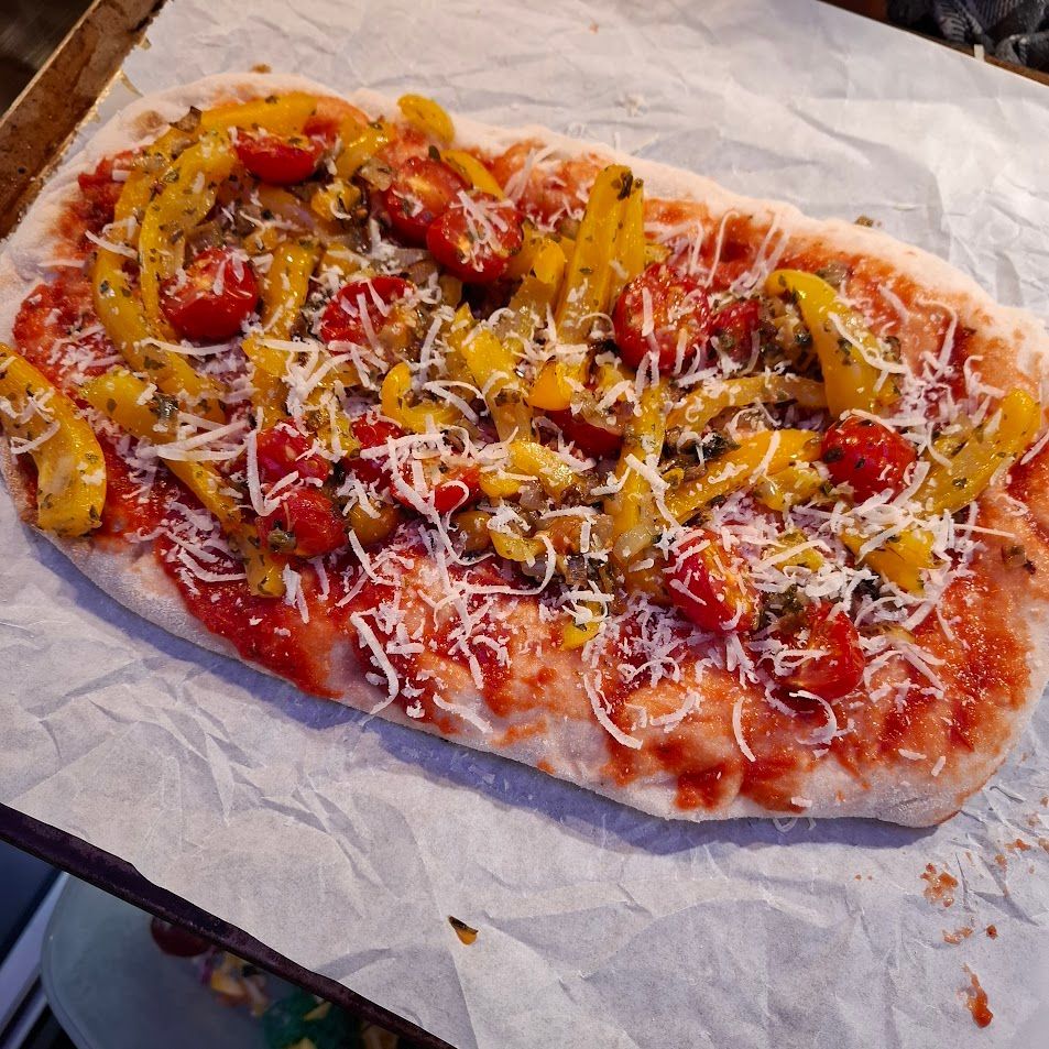 Andrea, de eigenares en ik waren wat aan het kletsen, over mijn boek en mijn neus. Eerder had ik gevraagd aan haar of ze burrata op voorraad had. Niet, maar wel buffelmozzarella. Na het kletsen vertelde ik, dat ik pizza willen eten en een bodem wilde maken. Dat hoefde niet want de winkel had verse pinsa in de vriezer. Natuurlijk kocht ik die. Vandaag heb er pizza mee gemaakt. Vandaar de titel: pinsa pizza. Dit was zo lekker. Volgende week zaterdag weer. Hier kan geen supermarkt pinsa of flatbread tegenop.
