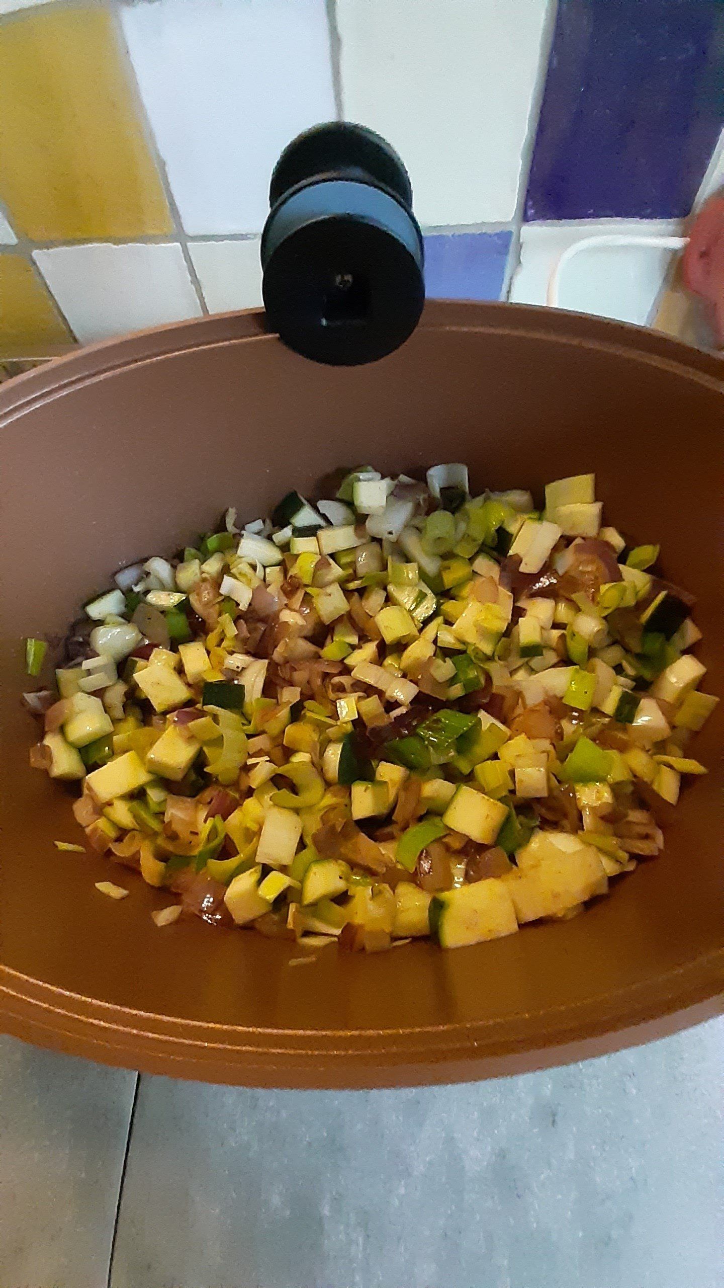 - Roer alle groenten om. Zodra de groenten lekker warm zijn en wat bruin, zet dan het apparaat uit. Zet daarna weer aan en kies dan voor slowcooken - hoog.