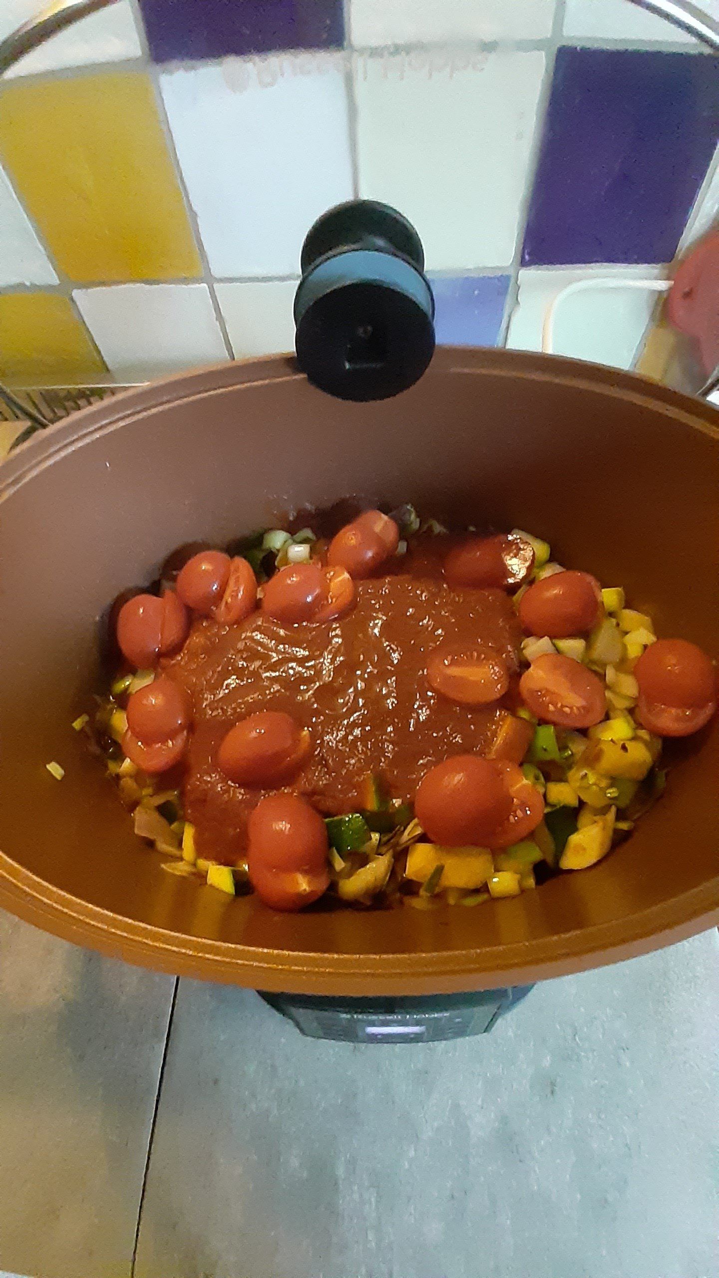 - Zet de timer op 4 uur. Giet de tomatenbasis erbij, samen met de gehalveerde tomaten.