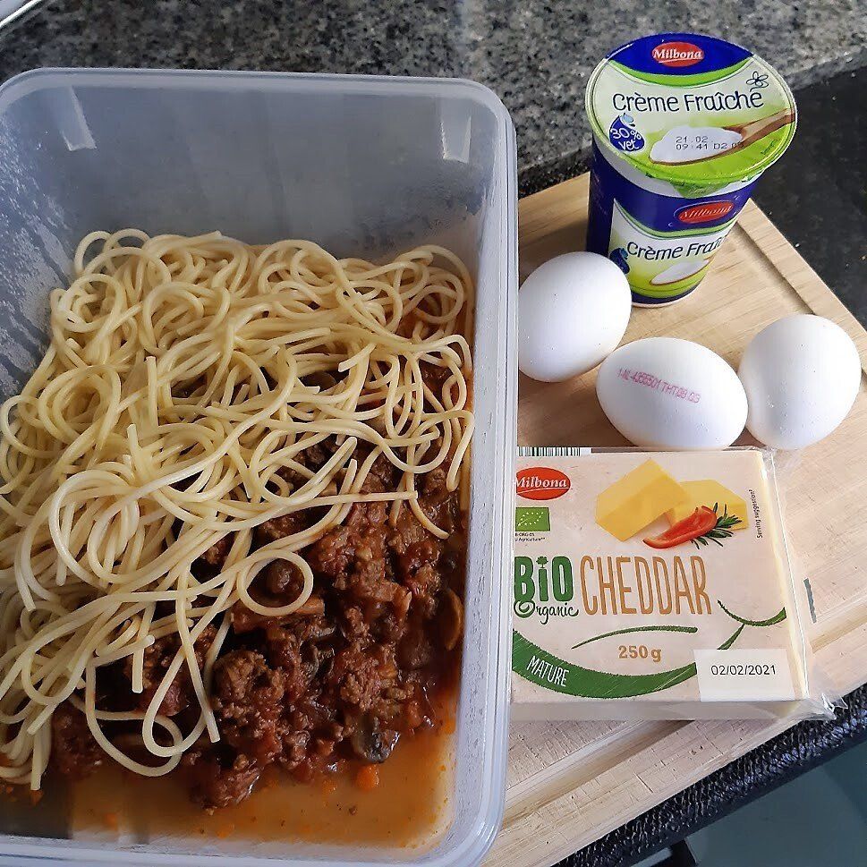 Recepten zijn voor 2 personen. Eén dag spaghetti met saus eten. De andere dag als taart. Maar wel met dubbele ingrediënten.