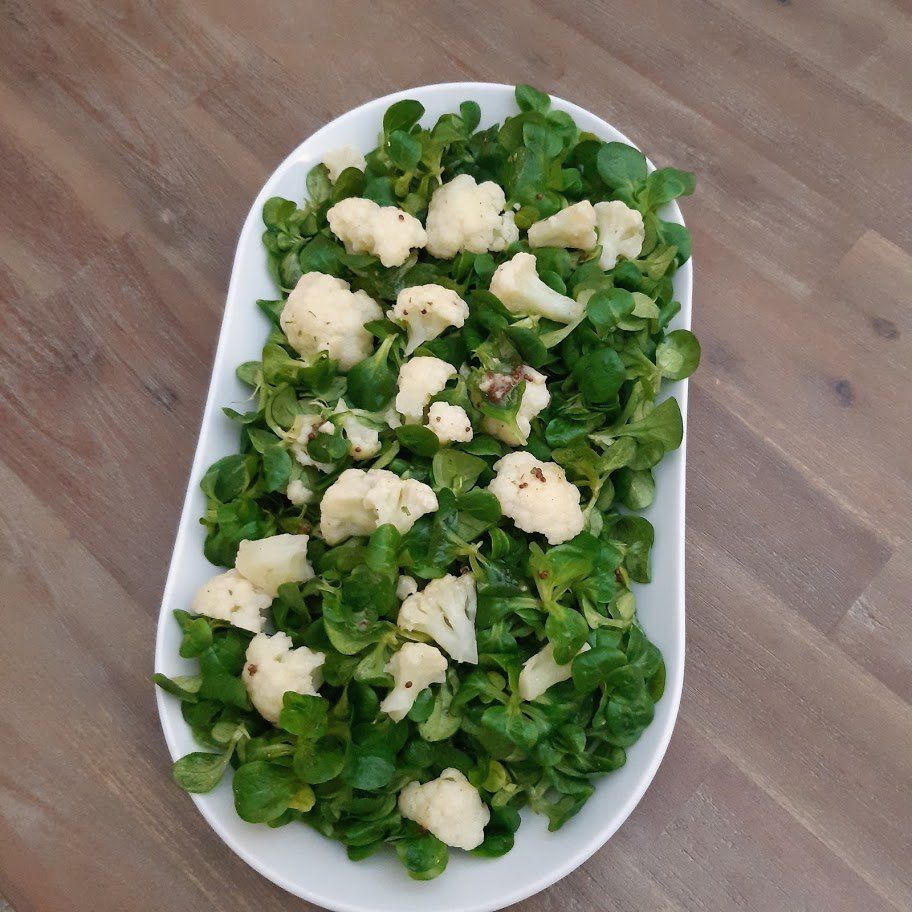 Veldsla met bloemkool, geroosterde puntpaprika en gekookte eieren